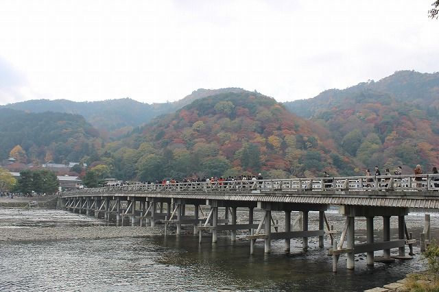 なんとも有名な渡月橋。JRやバスでアクセスできます。あいにくの天気だったのと、ちょっと紅葉には早かったかもしれません。(電車は観光客で満員でした。)