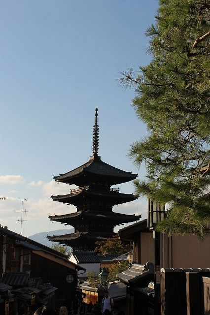 京都の五重塔といえば世界遺産の東寺が有名ですが、こちらは清水とは逆方向、京都駅の南西方向にあります。こちら八坂の塔は東寺ほどのスケールはありませんが、清水寺や高台寺観光のついでに見て回れるのでお勧めです。坂から見下ろすアングルは、京都土産「おたべ」のラッピングイラストになっていることでも有名です。この辺りは観光客だらけです。